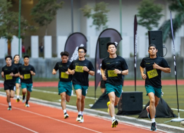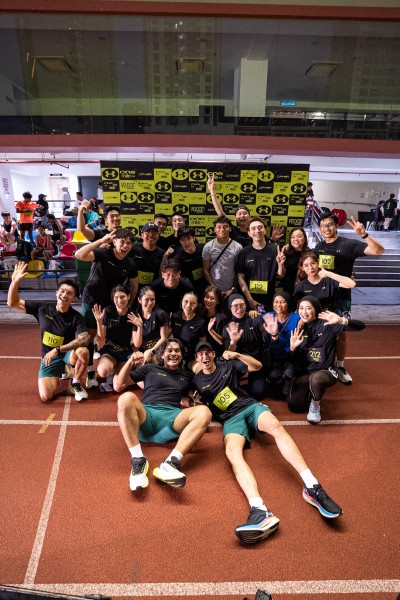(Dari depan ke belakang): Duta Under Armour dan pelakon Alif Muhaimin, pencipta kandungan Shawn Lee, pelakon Thompson Goh, pencipta kandungan Dennis Yin dan Lim Boon Nian, Duta Under Armour serta pelari ultramaraton Jeff Lau, dan pencipta kandungan Perry Kuan berlari dalam Velociti Race.